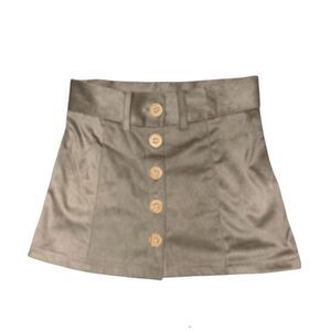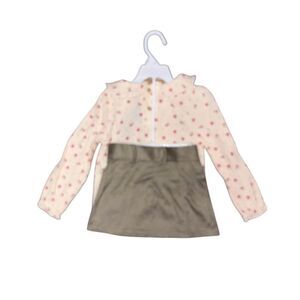 style. Shirt: organic cotton gauze fabric. Peter Pan collar with ruffle trim. Ruffle cuffs. Allover floral print. Skirt: faux sueded stretch-polyester fabric. Button front closure. Belt loop. Size: 4. NWT.