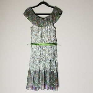 A white dress with a floral/ paisley pattern featuring purple, green and yellow accents. Dress also has a green satin sash to tie at the waist.