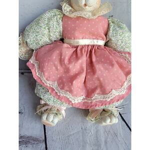 Rabbit Doll Figurine Shelf Sitter Ceramic Head, Hands Body Handmade Clothing in good condition.