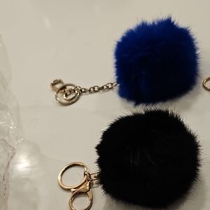 Set of 9 ( 2 sizes) rabbit fur pom pom keychains in black and blue. Features gold-tone hardware.
