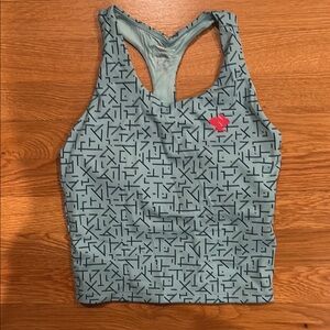 Stylish tank top with a geometric pattern. Features a racerback design and a small red logo accent.