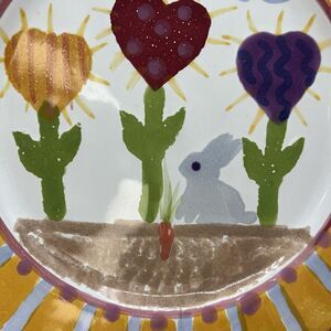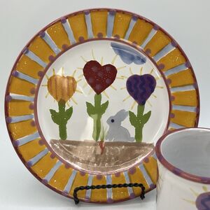 Studio Art Pottery Hand Painted Childs Plate Cup Set Flower Bunny Rabbit Hungary