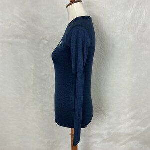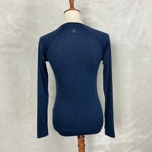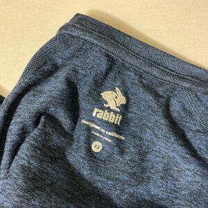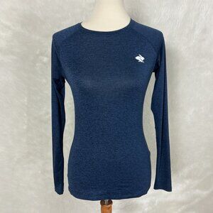 This is a long sleeve, heather blue, stretchy running tee from Rabbit. Polyester, spandex. No flaws. For reference the mannequin is a size 6-8 with measurements of: 34 in 26 in 35 in.