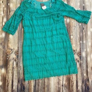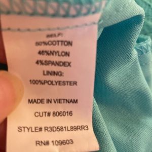 Such a pretty turquoise dress. See pic of materials. It’s about 18” armpit to armpit, 3/4 sleeves and 36.5 in length. Top to bottom. Comes right to my knees and I’m a petite 5’2