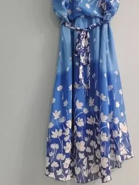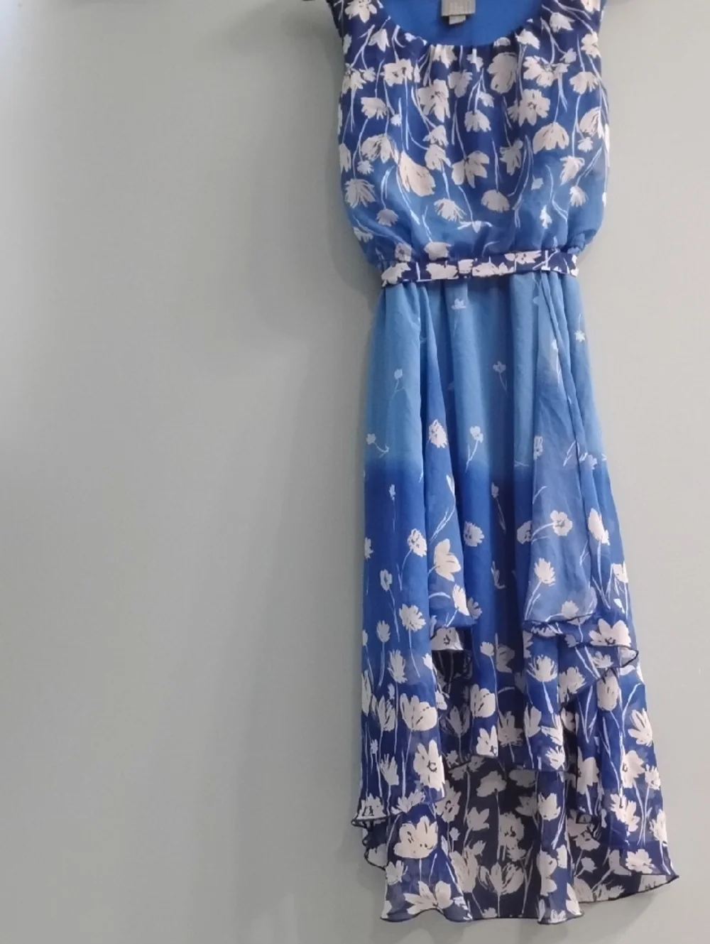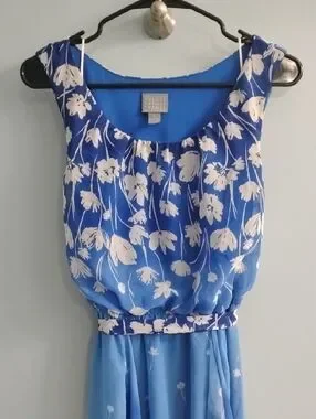 Lightweight blue dress with white floral print. High-low hem for movement. Scoop neckline and elastic waist. Sheer layered chiffon fabric. Feminine and breezy style.