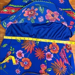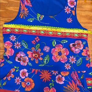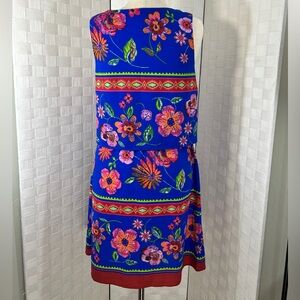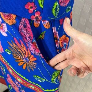 Rabbit rabbit rabbit. Cute dress with vibrant floral design. Features blue, pink and red floral pattern.