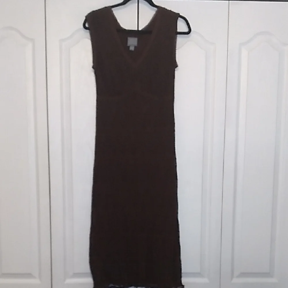 This brown midi dress features a flattering lace sheath silhouette. Designed with a sleeveless cut and a v-neckline, it offers a chic and comfortable fit for everyday wear.