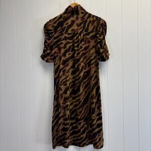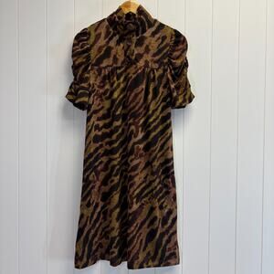 Stylish midi dress with animal print. Features puff sleeves and a high neckline. Perfect for any occasion.
