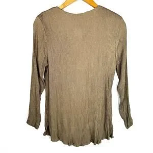Gorgeous Rabbit Rabbit Rabbit brown stretchy blouse with button front, v-neckline, and shoulder pads. Size tag says 14 but this fits like a small-medium.