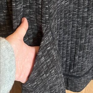 Elegant charcoal knit dress with a cozy cowl neck. Ideal for stylish comfort. Cute detailing at bottom hem and it has pockets!!