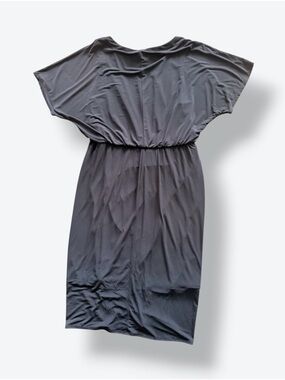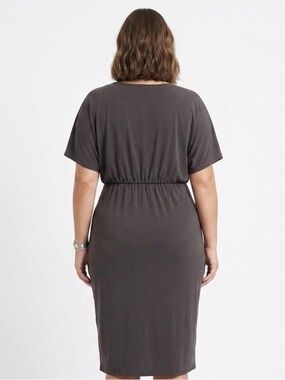 Soft charcoal midi with gathered side ruching. Short dolman sleeves and a round neckline. Subtle drape over the waist for a sleek silhouette.