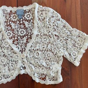 Intricate crocheted lace bolero in cream. Scalloped edges and floral motifs. Single-button closure at front. Lightweight and elegant layering piece.