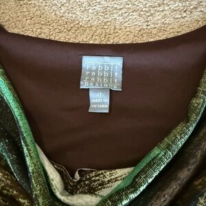 This stunning Rabbit Rabbit Rabbit Designs dress features a beautiful abstract print in earthy greens, teals, browns, and golden tones with a subtle shimmer throughout. The soft draped cowl neckline and comfortable stretch fabric make this an effortless, flattering piece for work, events, or everyday chic. Fully lined for a smooth silhouette!