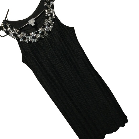 Keywords: Rabbit Rabbit Rabbit Designs, black dress, embellished dress, jeweled neckline, cocktail dress, party dress, sleeveless dress, women's dress, formal dress, evening dress, special occasion dress, size 14, aline dress, textured dress