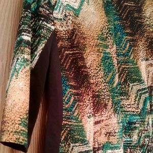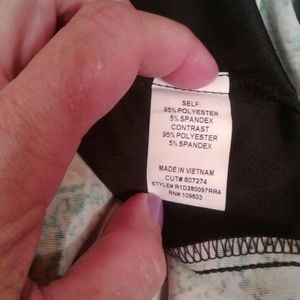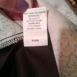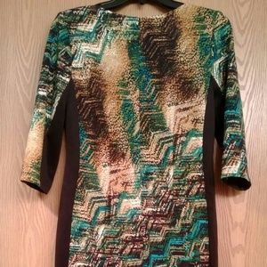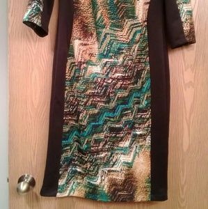 Allover unique dress, color, and pattern. Slip-on shift dress. Very gently used. Fabric is 95% polyester and 5% spandex, machine washable. Bust is 18.5", waist is 16.5" and length is 38" with stretchy material.