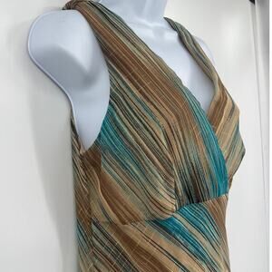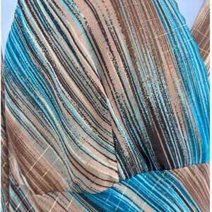 Faux wrap on top with babydoll waist, Stripes in tan, brown and aqua blue, handkerchief hemline for flowy movement