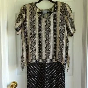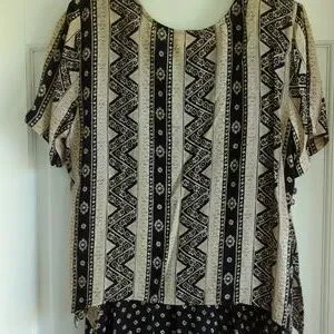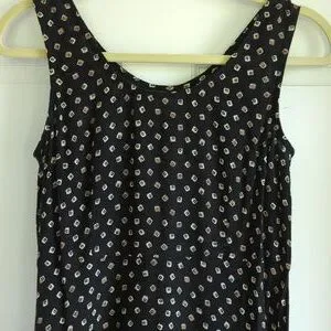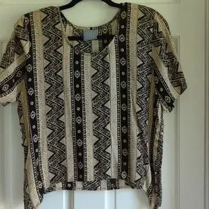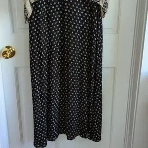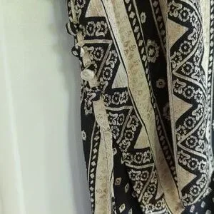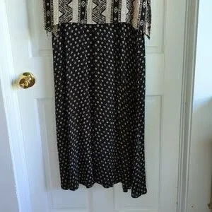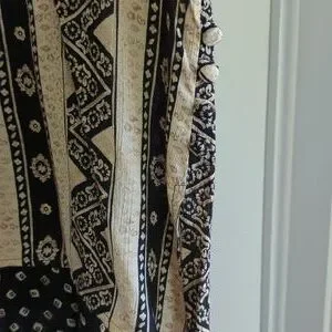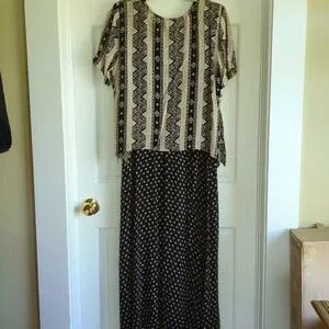 beige and black multi patterned maxi dress, with overlay, short sleeved handkerchief hemline top. button details, slits on side. tank dress that can be worn by itself. top has shoulder pads, but could be removed. length= 51.5 inches rayon. EUC
