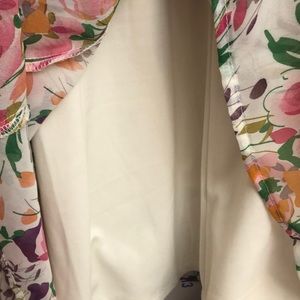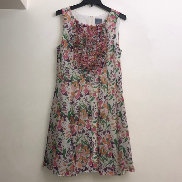 Sleeveless dress in gorgeous floral pattern with extra detailing in front. Fully lined with full zipper going down the back of the dress.