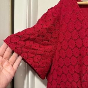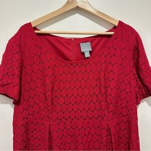 This is a red lace dress by the brand Rabbit Rabbit Rabbit. It features short sleeves, a scoop neckline, and an empire waist.
