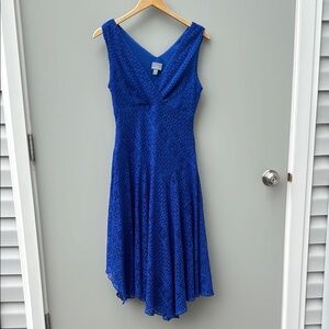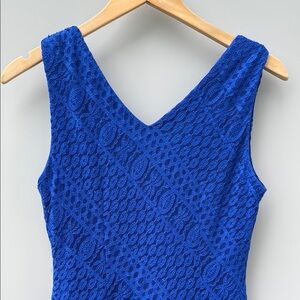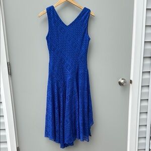Rabbit Rabbit Rabbit electric blue overlay lace asymmetrical dress. V-neck sleeveless lined. Has stretch.