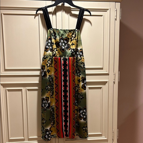 Bold floral and geometric patterns. Black straps. Striking design.