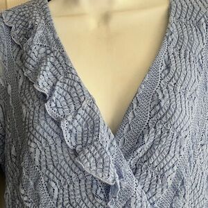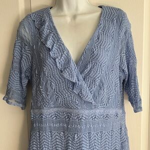 Charming light blue midi dress with lace detail. Features a flattering V-neck and short sleeves. Ideal for any occasion.