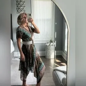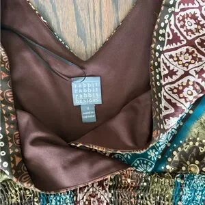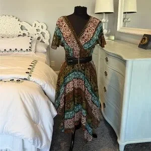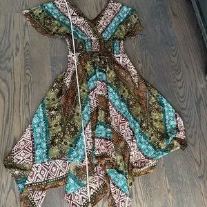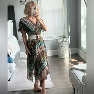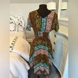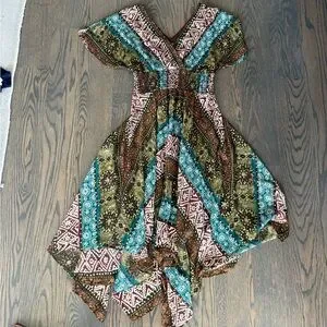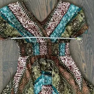 Bohemian midi dress : V-neck design, smoked elastic waist, V back, flutter sleeve. The gorgeous gauze fabric showcases a mix of green, blue, and brown patterns with dots of metallic gold. Very festive and feminine.