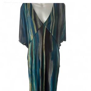 Elegant dress with multicolor stripes. Features a draped back and gathered waist. Perfect for any occasion.