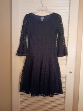 Chic navy lace mini dress with three-quarter bell sleeves. Fitted waist and a flared A-line skirt. Intricate all-over lace for a feminine look. Ideal for evenings and special outings.