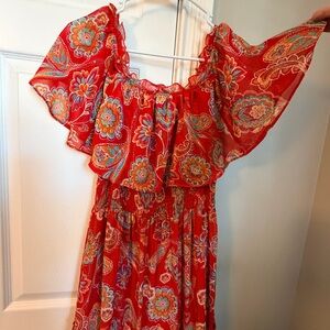 Elegant red dress with floral patterns. Features a ruffled neckline.