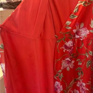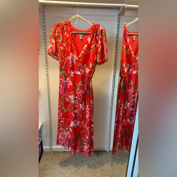 Bold red floral high-low wrap dress with V-neck. Short sleeves and a tie waist create definition. Lightweight, flowy fabric with pink and green floral print. Elegant movement for daytime or evening wear. used only once