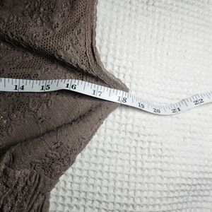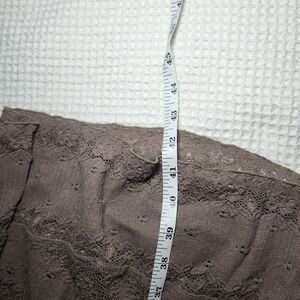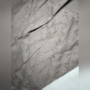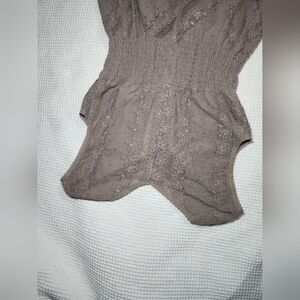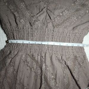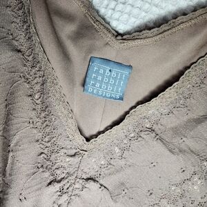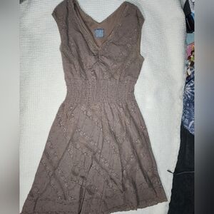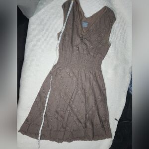 Sleeveless V-neck mini dress by Rabbit Rabbit Rabbit. Smocked waist offers a defined shape. Lace-overlay fabric with subtle patterning. Flared skirt for easy movement. Neutral taupe color for versatile looks. No rips or stains. No size on the dress but based on measurements and fit id say Small.