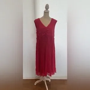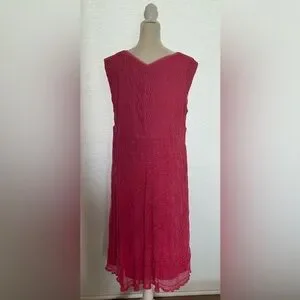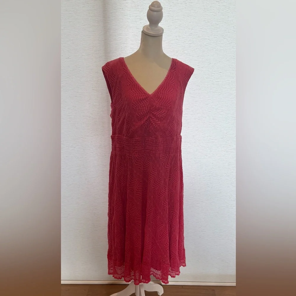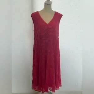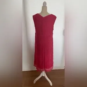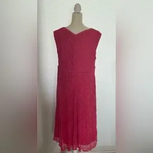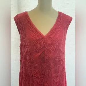 Chic coral colored midi dress with textured pattern. Sleeveless design. Perfect for versatile styling.