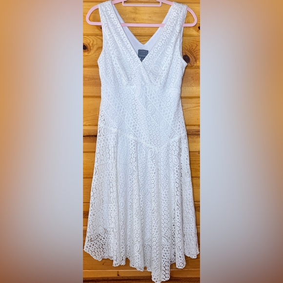 Chic asymmetrical lace dress. Features a flattering V-neck. Perfect for elegant occasions.