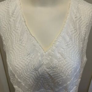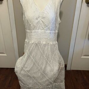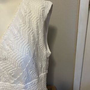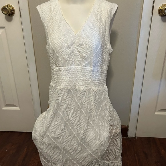 Chic white dress with textured pattern. Sleeveless design. Perfect for weddings.