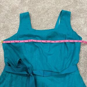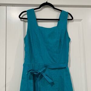 All order ship within 1-3 business days. This women's dress is made by Rabbit Rabbit Rabbit. The style is fit and flare, neckline is high (square), sleevless, knee length. Color is a teal blue. Fabric is cotton and polyester. Size is 10. Condition is great. Make me an offer!