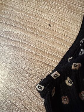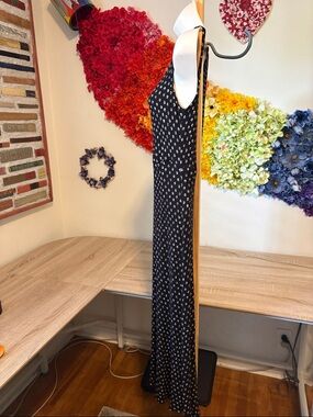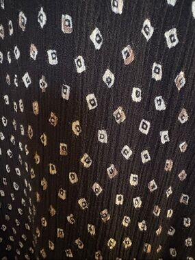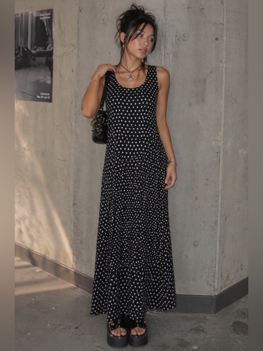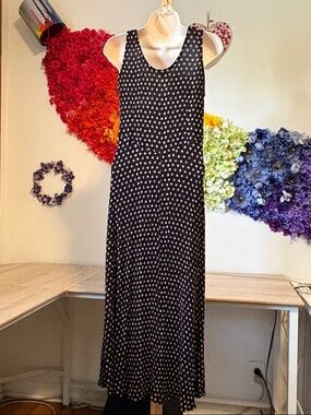 • The dress is a sleeveless, black midi dress with a fine, all-over geometric or small dot pattern.