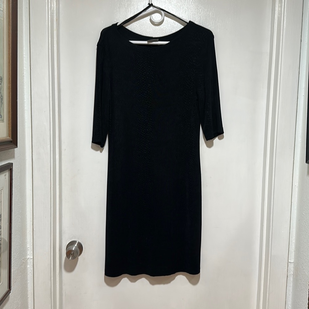 Rabbit Rabbit Rabbit black stretchy dress with subtle snakey pattern. Rear middle seam. Elbow length sleeve. Has three small spots on front only visible in bright direct light. Missing size tag but looks to be a large. Measurements: :8” shoulder to hem ; sleeve 7.5” ; 16.5” across pit to pit.