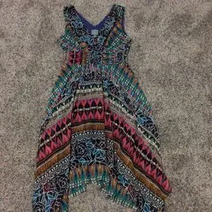 Rabbit Rabbit Rabbit dress with asymmetrical hem. Ruched waist and v neck.