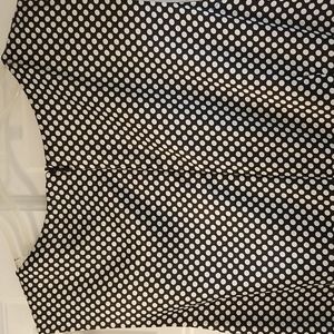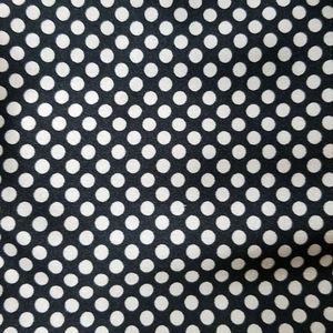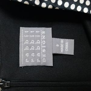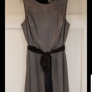 Classic black and white polka dot dress. 97% polyester and 3% spandex. Lining is 100% polyester. Sleeveless. Zipper down the back. Black tie at the waist
