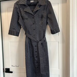 Chic navy striped dress with long sleeves. Features button-down front and waist tie. Ideal for versatile styling.