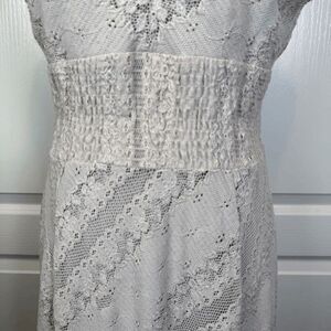 Rabbit Rabbit Rabbit Designs Crochet Lace Dress Cream Ivory Stretch Size 10. Nude Lining, fit and flare. elastic ruching on waist. Excellent condition. See photos for details and unstretched measurements. View my closet to add other items and bundle to save with one shipping fee!