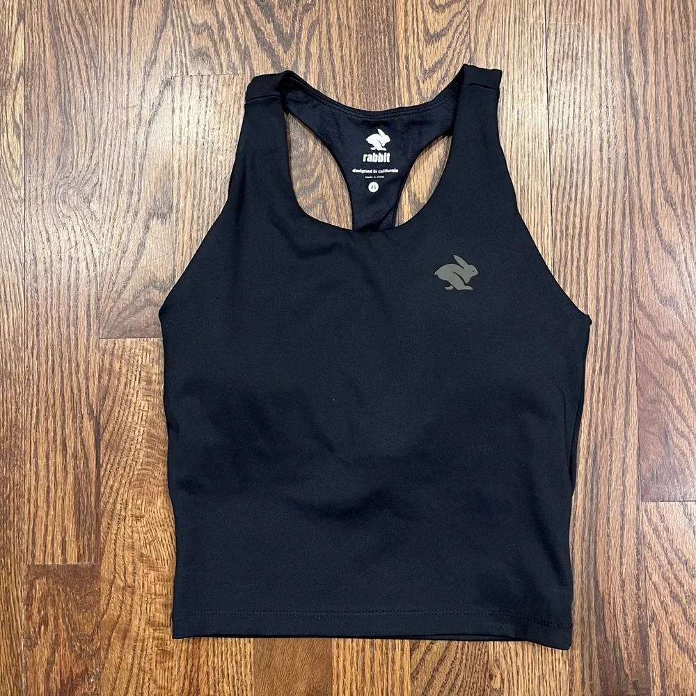 Black workout tank by Rabbit in size xs. This tank is very thick with a built-in, lightly padded bra and without any stretch. Barely worn in excellent condition! Please check measurements because this top is tiny.
