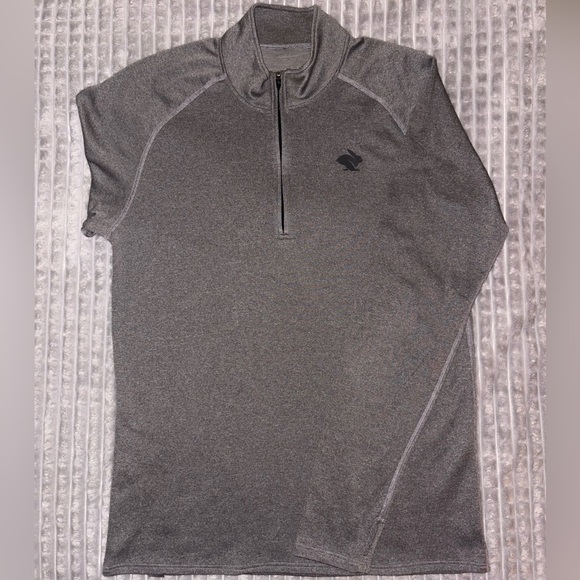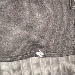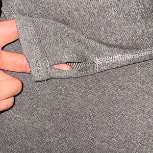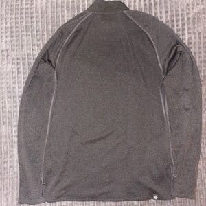 Poly/wool blend zip-up shirt with thumbholes at the end of sleeves. All other details are pictures.