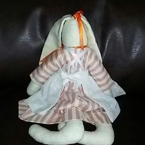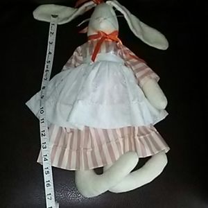 Charming floppy-eared stuffed rabbit, complete with orange and white striped dress and white apron. All handmade. Never used or played with. Drool-free!
