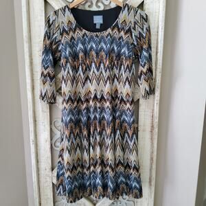 Chevron print in gray and gold 3/4 sleeve shift midi swing dress by Rabbit in a petite size 6.