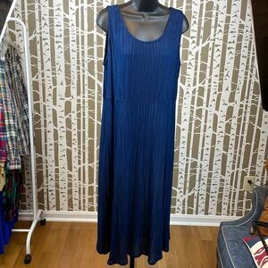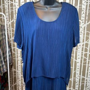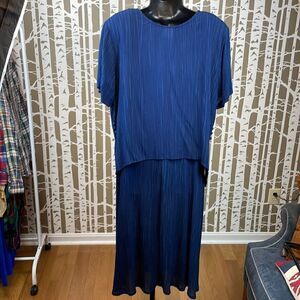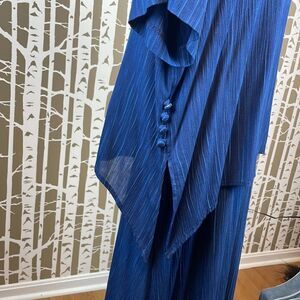 Rabbit Rabbit Rabbit 2 piece midi tank dress with separate loose fit shark bite hem top. Featuring a 2 piece set: tank style midi dress and a separate cropped shirt topper with asymmetrical hemline that drops lower on the sides and has fabric covered button accents. 100% breathable and soft rayon gauze fabric in shades of navy and blue vertical stripes. Top has shoulder pads. This is such a great find if you love the layered loose fitting Lagenlook and you are getting 2 pieces for the price of 1 - wear separate or together!! Gently worn with no flaws to note. See pics for measurements.
