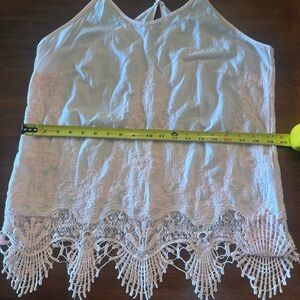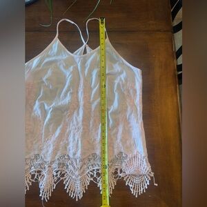 NWOT Acemi Womens Lacy Racer Back Crochet Tank Top light PINK Embroidered Lace Trim Sz L. Excellent condition as it was never worn. Perfect for the beach, a summer evening, or layered under a sweater.
