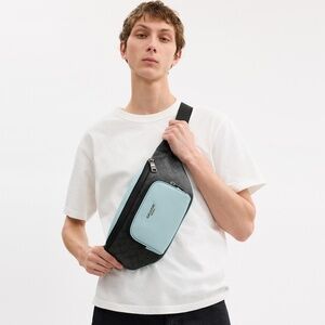 Signature coated canvas and smooth calf leather Inside multifunction pocket Zip closure fabric lining Outside zip pockets Adjustable strap with 41 3/4 length for wear at waist 16 1/4 (L) x 6 3/4 (H) x 3 1/4 (W) Style No. CAJ77