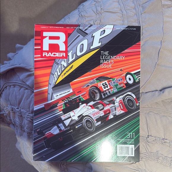 Explore the legendary races with this vibrant Racer magazine. Features dynamic car imagery and bold colors.